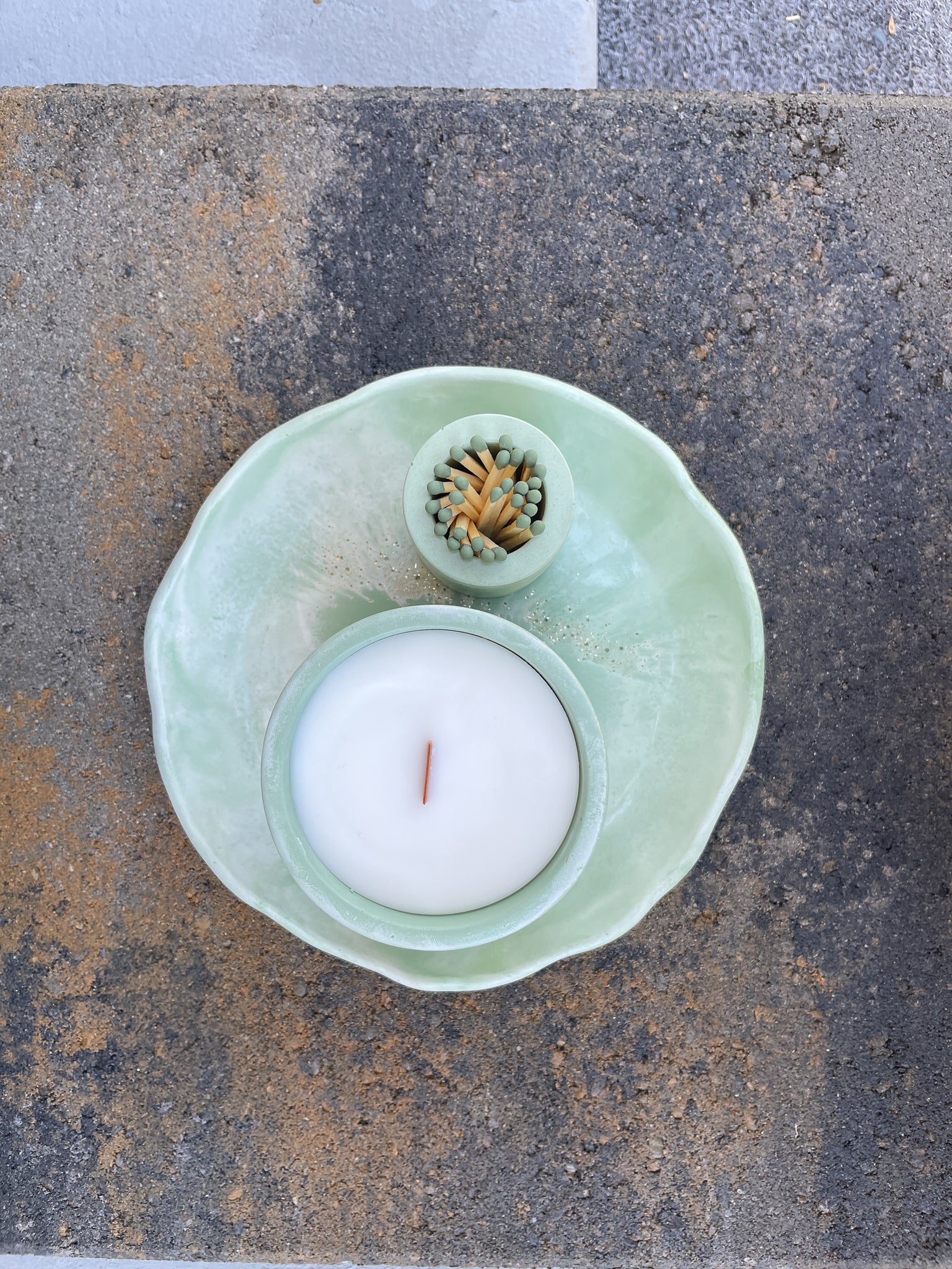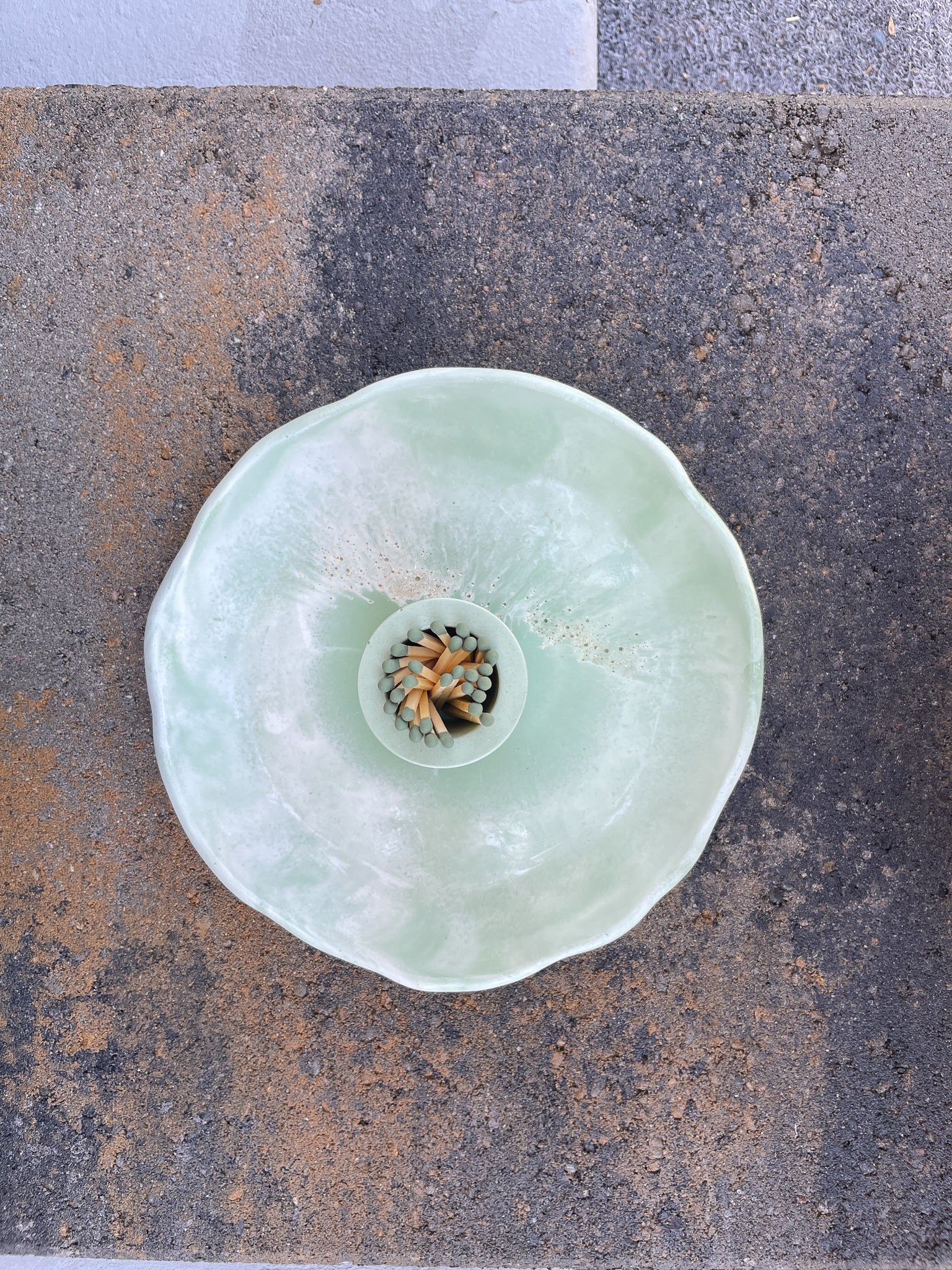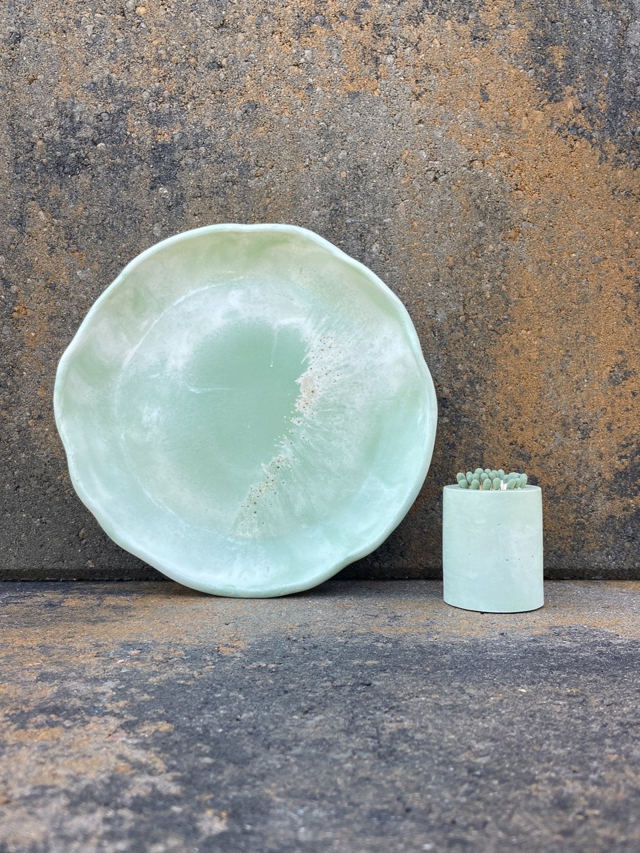 Handcrafted Botanical Charm: Each tray and match holder is carefully handmade from concrete, featuring a unique green and white marbled finish with gold glitter glass accents reminiscent of Balboa Park’s gardens. No two pieces are exactly alike, making this set truly one-of-a-kind.