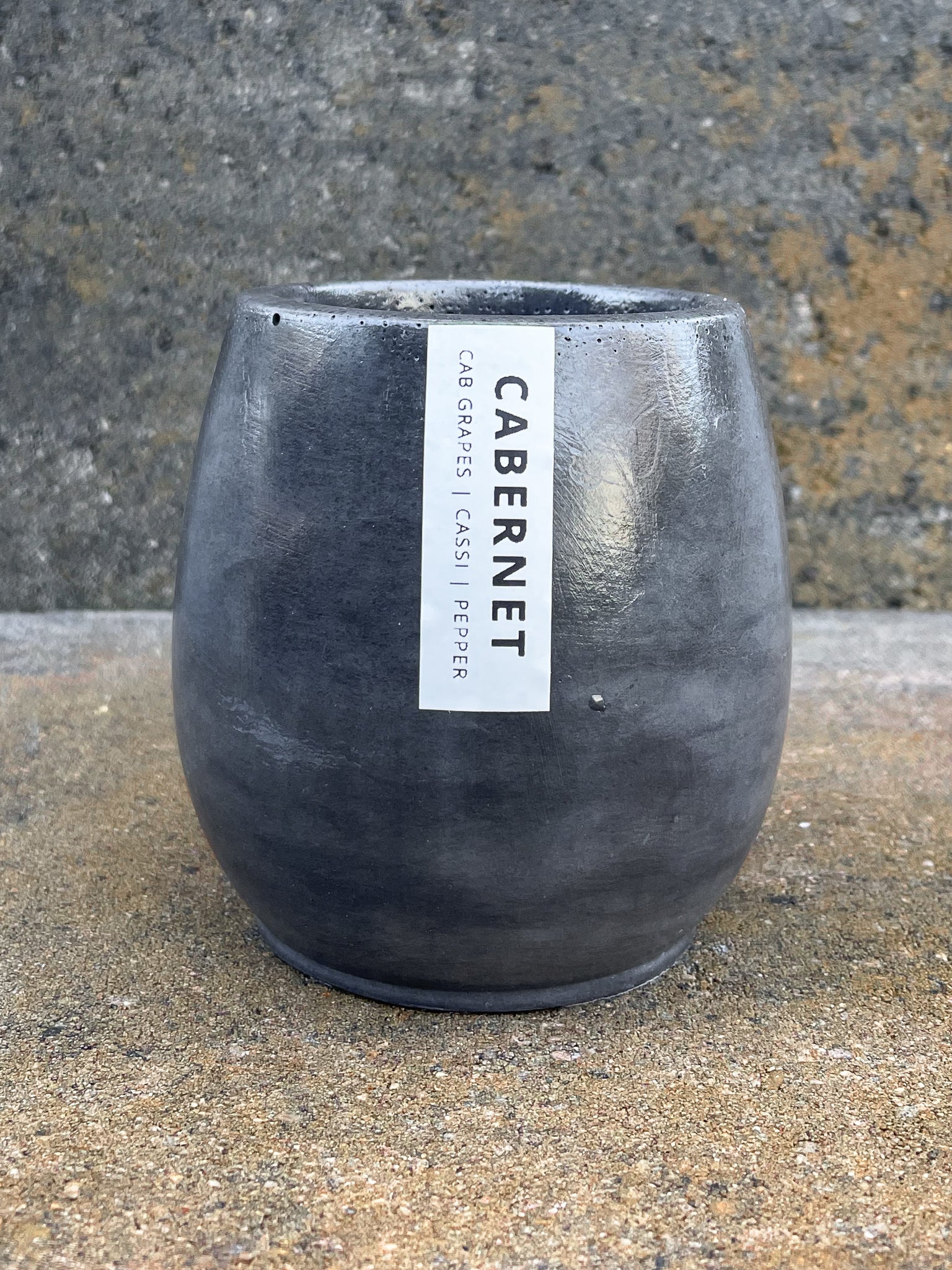 Each candle is meticulously handmade concrete vessel that mirrors the elegant shape of a wine glass, crafted to enhance the overall sensory experience. Each 8oz Cabernet candle is finished with a charcoal hue. The minimalist design of these vessels offers a versatile aesthetic that complements any decor, adding a touch of modern elegance and understated sophistication—perfect for our wine-inspired candle collection.