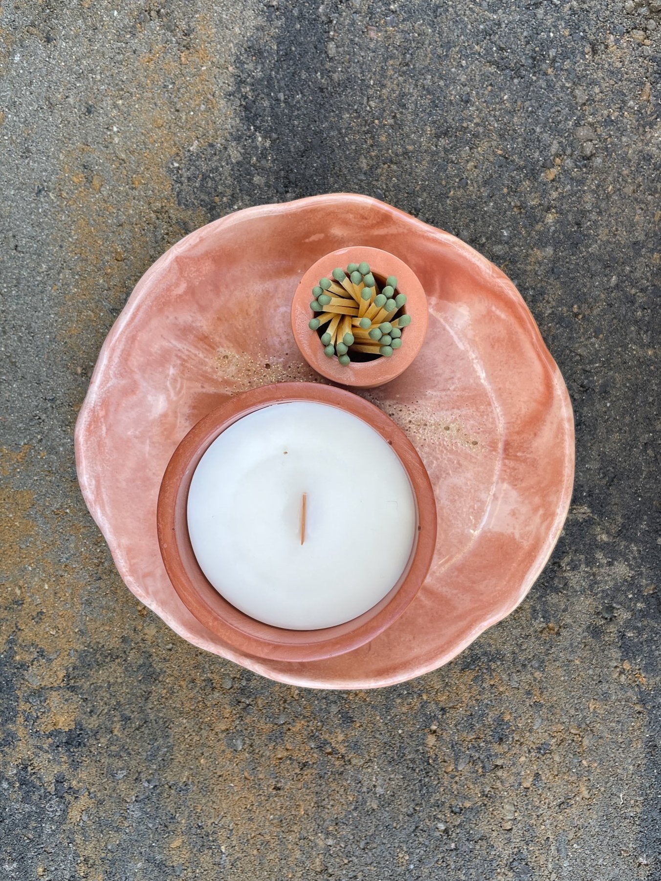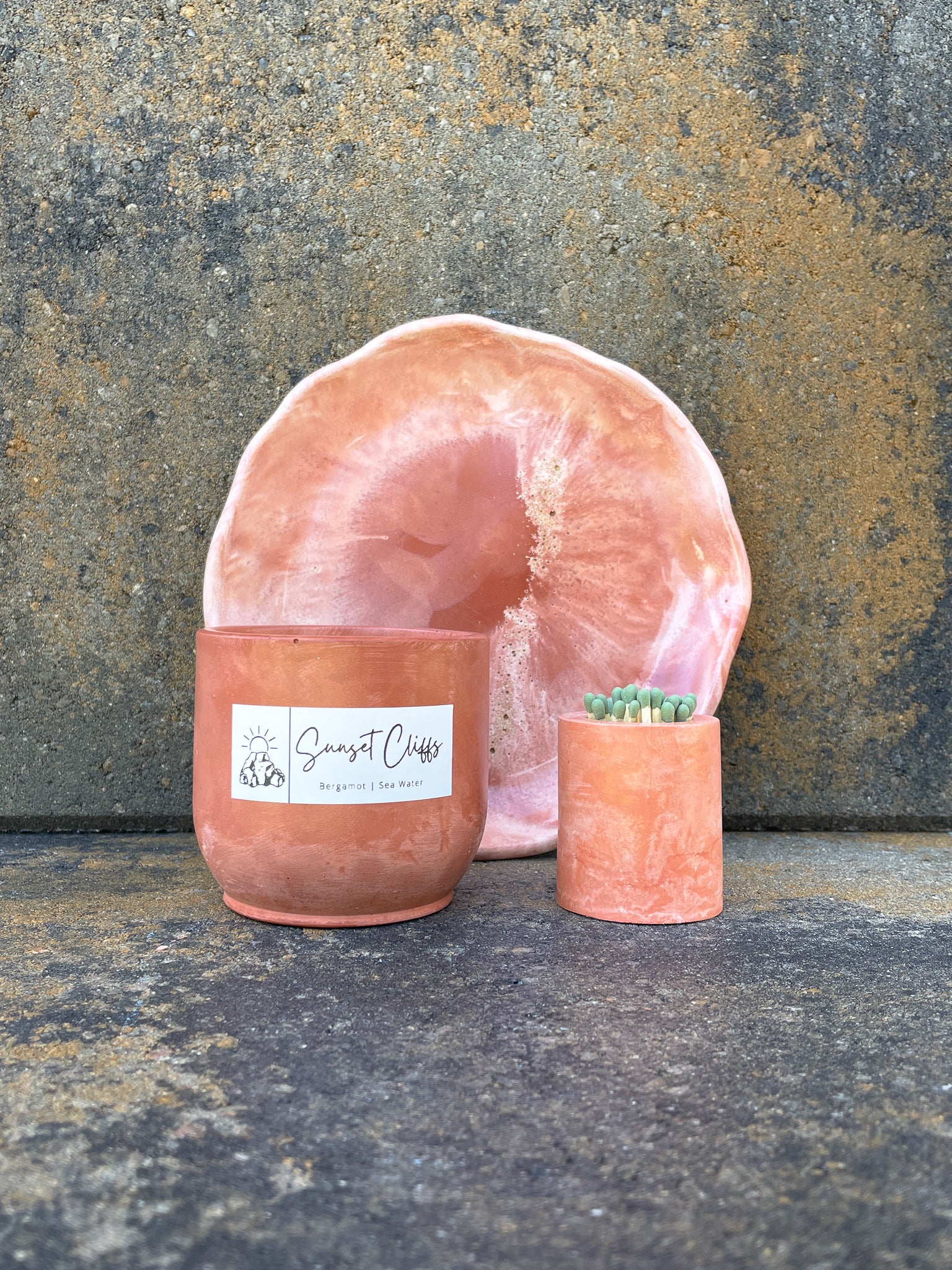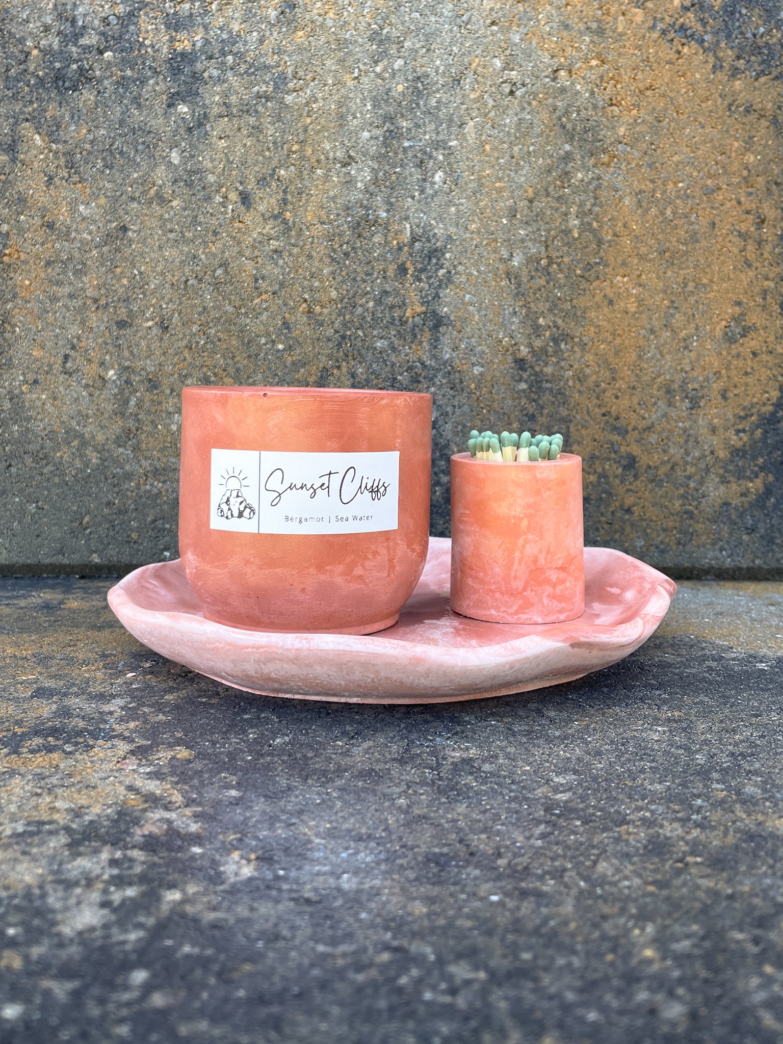 Bring the serene beauty of San Diego’s coast into your home with our Sunset Cliffs Candle & Tray Bundle. This set includes our signature Sunset Cliffs candle, capturing the essence of ocean air and coastal cliffs, paired with a matching handmade tray and sleek match holder. The match holder, with a striker on the bottom for easy lighting, adds both function and style to your decor. (Matches not included.)