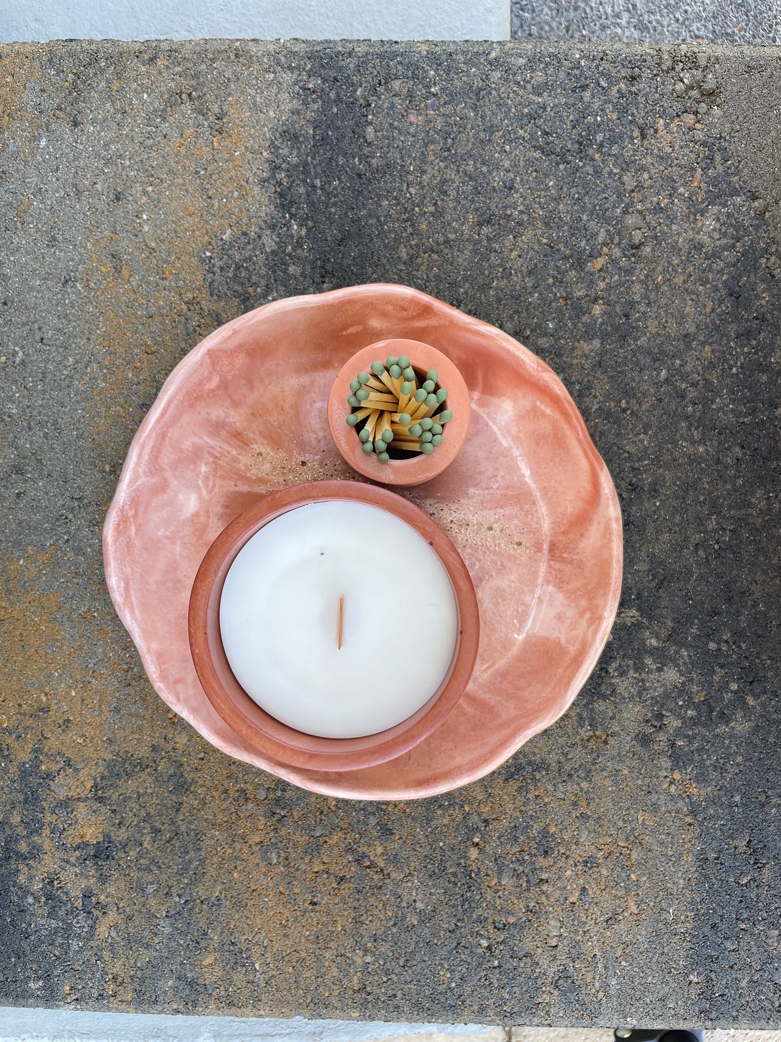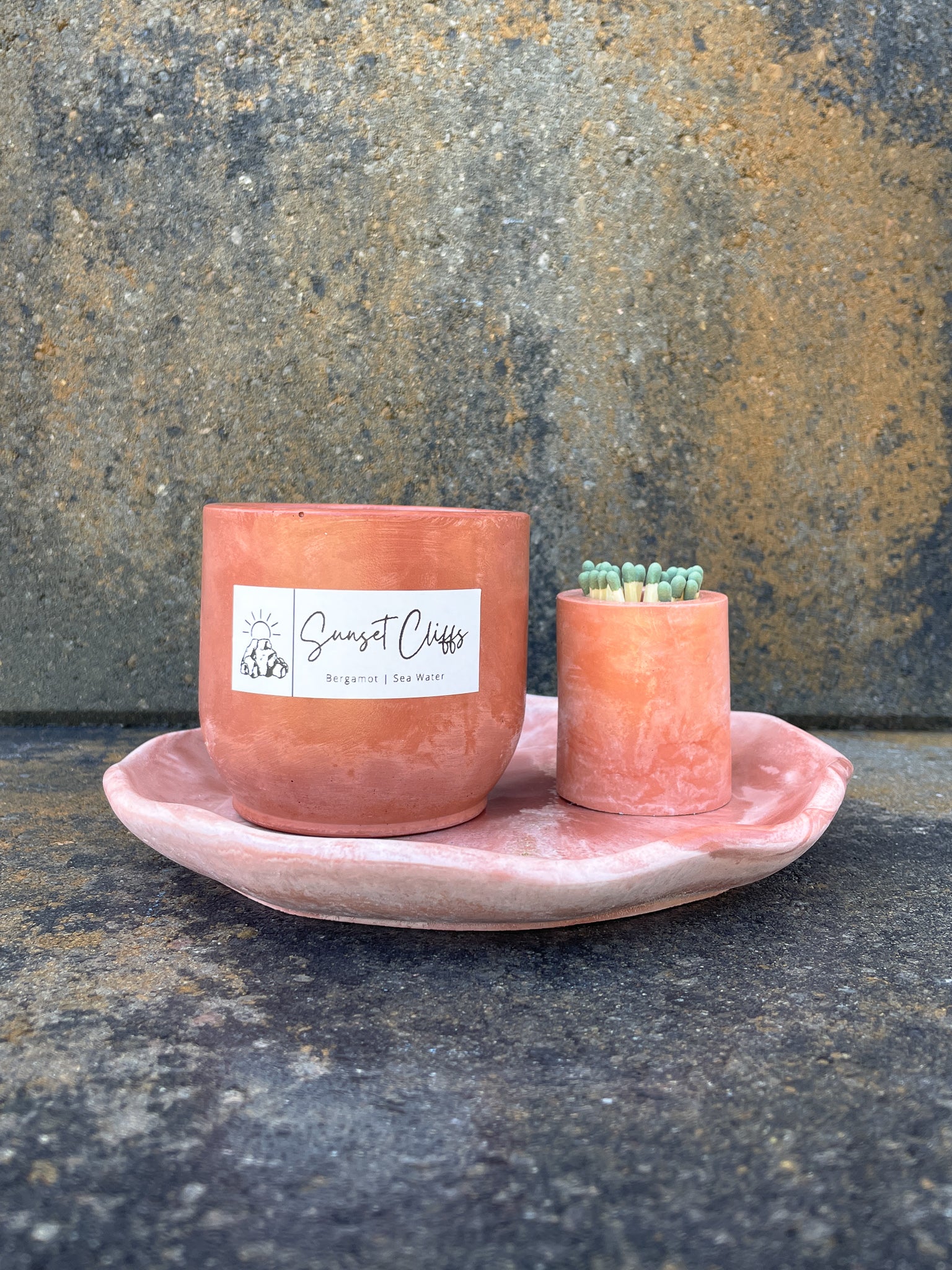 Embrace the warm hues of a coastal sunset with our handcrafted Sunset Cliffs Candle Tray & Match Holder Set. Inspired by the breathtaking views of Sunset Cliffs, this set captures the essence of Sunset cliffs with warm terracotta and white swirls bringing a touch of natural beauty and serenity into your home.